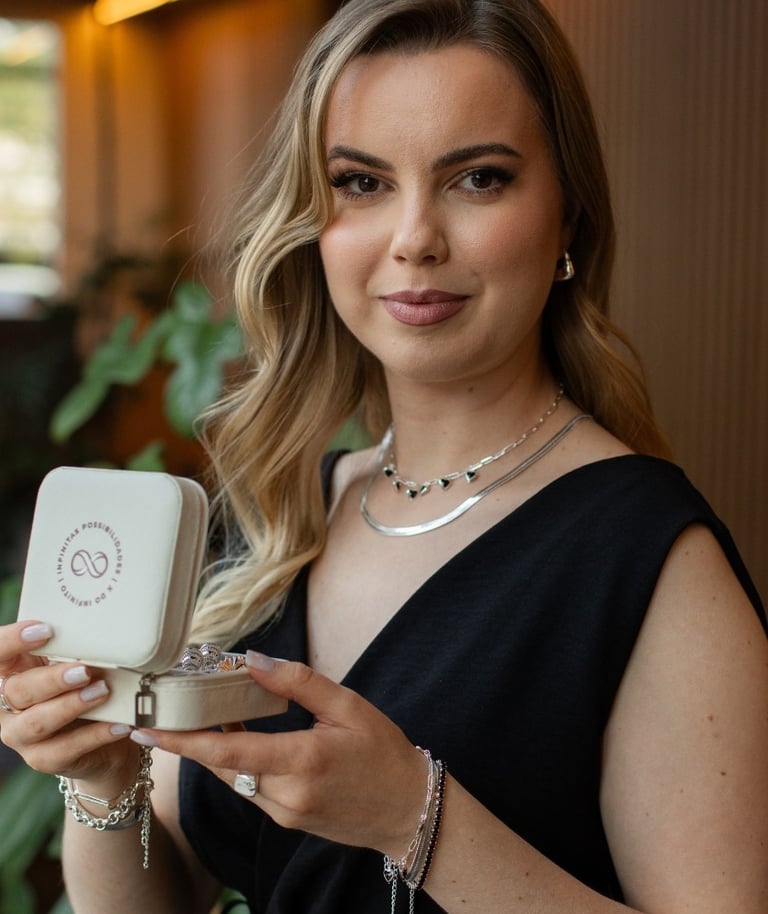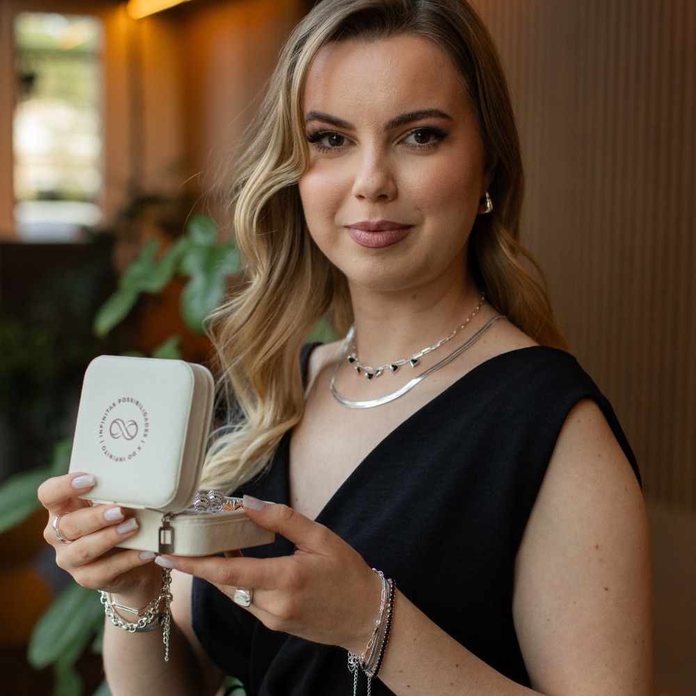 com a X do Infinito, você terá em mãos uma maleta exclusiva e completa, cheia de semijoias de alta qualidade, banhadas a ouro 18k e prata, e peças hipoalergênicas.